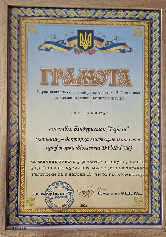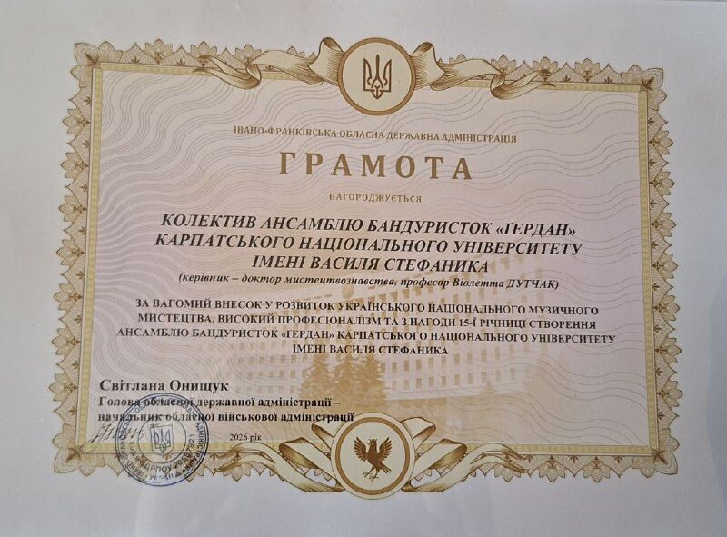 4 березня 2026 року в залі Івано-Франківської обласної філармонії імені Іри Маланюк відбувся концерт “УКРІПИ НАС, ЛЮБОВ!” до 15 -річного ювілею квартету бандуристок “ҐЕРДАН” Карпатського національного університету імені Василя Стефаника (керівник – докторка мистецтвознавства, професорка Віолетта Дутчак). Учасниці колективу – Надія Вівчарук, Наталія Федорняк, Світлана Матіїшин, що розпочинали свою творчість ще у студентському колективі, сьогодні – викладачі та концертмейстери кафедри музичної україністики та народно-інструментального мистецтва. У концерті, що органічно підсумував творчий доробок колективу, прозвучали академічні композиції, обробки народних пісень, пісенна українська естрада.