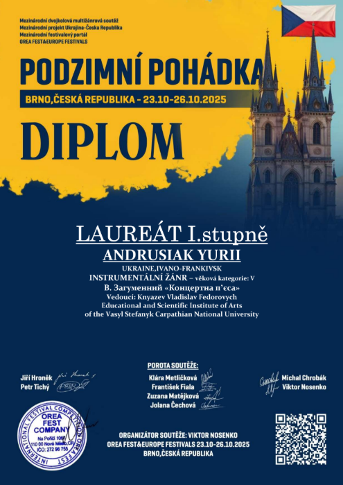 Міжнародний двотуровий мистецький конкурс «Podzimni Pohadka» 23.10 –26.10. 2025 м. Брно (Чеська республіка)