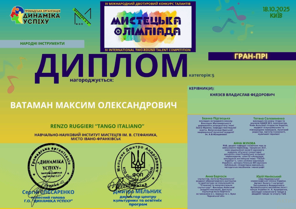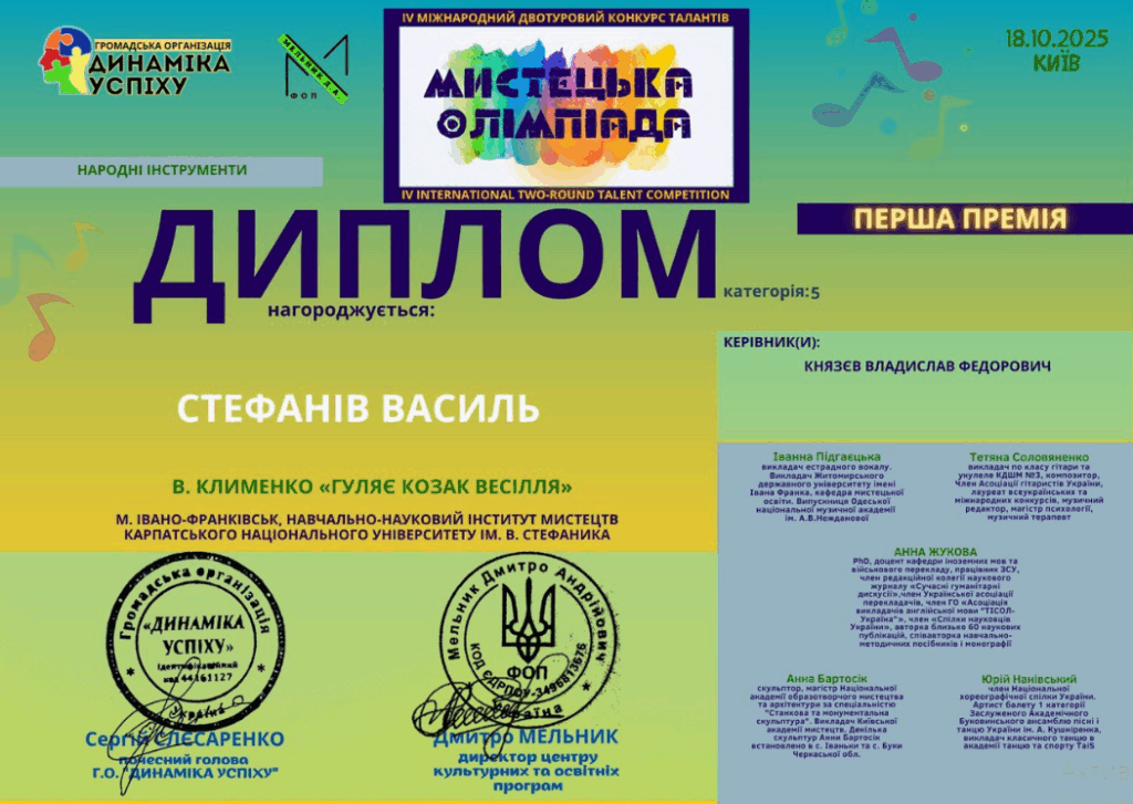 Міжнародний двотуровий дистанційний конкурс мистецтв «Свято творчості» осінь 2023 в номінації «Народні інструменти»